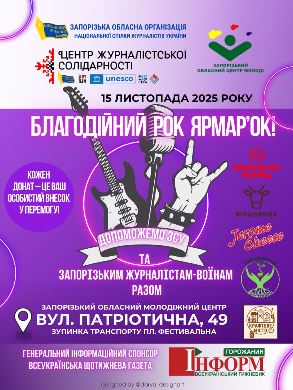 Запорізька обласна організация Національной спілки журналістів України Запорізький Центр журналістської солідарності  Запорізький обласний Центр молоді запрошують запоріжців на благодійний «РОК ЯРМАР’ОК»! Допоможемо ЗСУ та запорізьким журналістам-воїнам разом! Завітайте, підтримайте, відпочиньте! Буде цікаво, музично і корисно! ДЕ?: Запорізький обласний молодіжний центр, вул. Патріотична, 49, зупинка транспорту пл. Фестивальна КОЛИ?: У суботу, 15 листопада 2025 року ЧОМУ ЯРМАР’ОК? Свої унікальні вироби представлять … Читати далі…