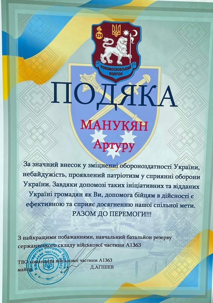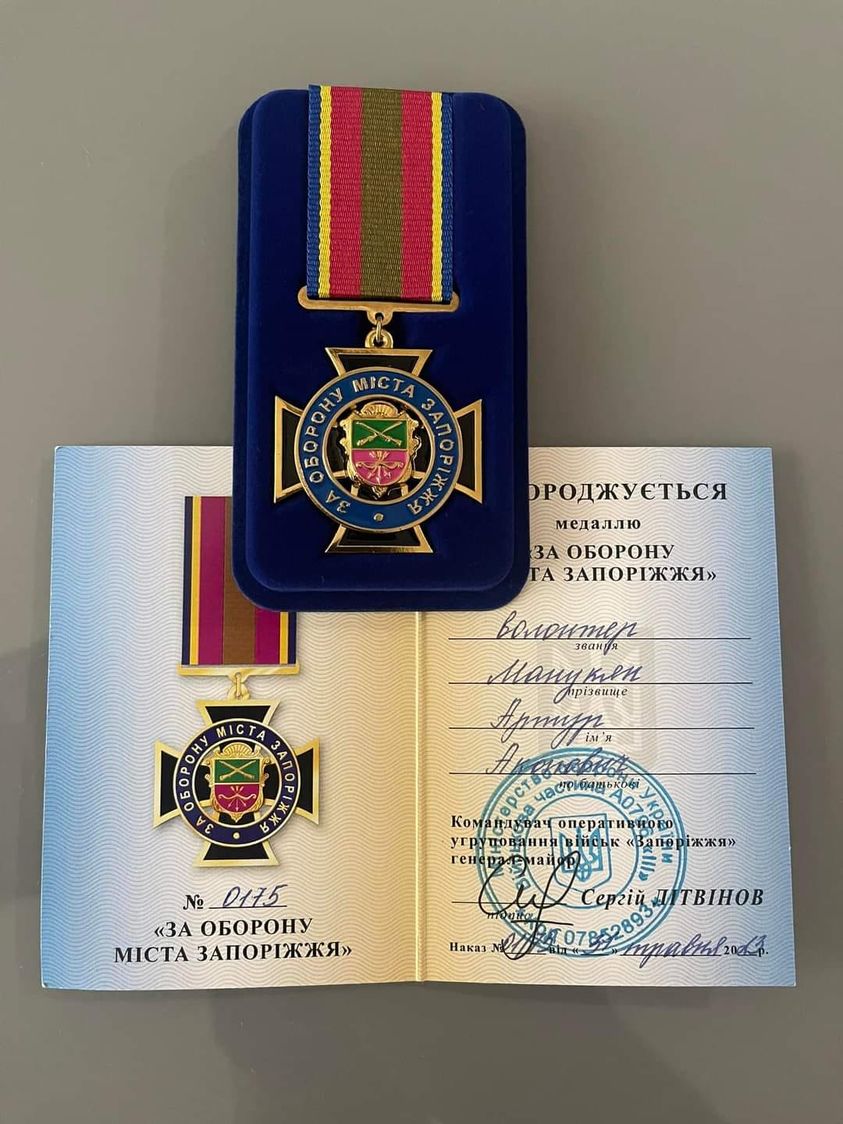 У рамках конкурсу «Благодійне Запоріжжя-2022» «Благодійність на захисті України»  керівник БФ «Дій заради добра» Артур Манукян посів 2 місце у номінації «ВОЛОНТЕР РОКУ», також був нагороджений медаллю «ЗА ОБОРОНУ МІСТА ЗАПОРІЖЖЯ», нагороду вручив йому особисто командувач оперативного угрупування військ «Запоріжжя», генерал-майор Сергій Літвінов.