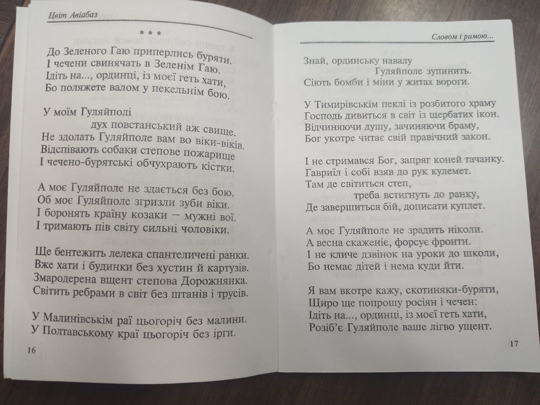 Поетична збірка гуляйпільської поетеси Вікторії Забави “Словом і римою” вийшла під псевдонімом Цвіт Авіабаз, щоб убезпечити авторку, яка на початку війни жила в кількох кілометрах від лінії фронту, перебувала по суті в театрі бойових дій, під ворожими обстрілами, у підвалі писала свої неймовірно сильні за патріотичним духом вірші. Це не просто вірші, а літопис війни, доволі відвертий, що передавав всю інформацію про зруйновані пам’ятки, топоніми рідного краю.