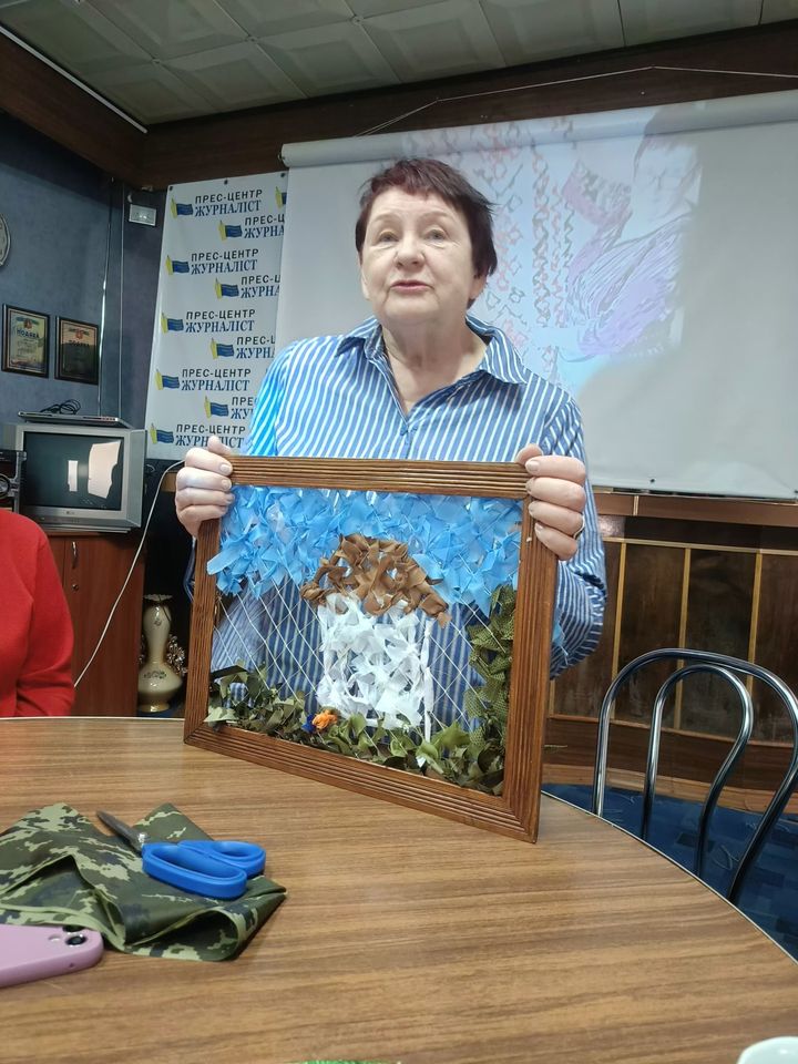 Про те, як із рибальської сітки і клаптиків тканини невтомними жіночими руками виготовляються маскувальні сітки для потреб наших військових, Валентина Степанівна розповіла журналістам в Центрі журналістської солідарності м.Запоріжжя. Вона пригадала, що перші сітки розміром 42 кв.м були важкі – 32 кг. Зараз їхня вага 6,5 кг. Змінилися матеріали і технологія виготовлення. Сітки проходять тестування за участю військових. Вони повинні задовольнити вимоги бійців, адже від цього залежить їхнє життя і збереження техніки. В залежності від пори року сітки бувають зелені, жовті, білі.