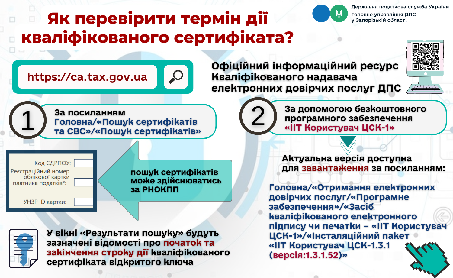 Вхід до інформаційно-комунікаційної системи «Електронний кабінет» (далі – Електронний кабінет) здійснюється за адресою: https://cabinet.tax.gov.ua, а також через вебпортал ДПС (https://tax.gov.ua). Робота у приватній частині Електронний кабінет здійснюється після проходження користувачем електронної ідентифікації онлайн з використанням кваліфікованого електронного підпису.